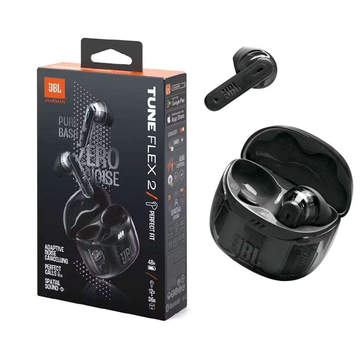 JBL Tune Flex 2 earbuds feature 12mm dynamic drivers that deliver powerful JBL Pure Bass sound. And whether you're listening to your favorite playlist, watching a movie, or playing a game, JBL Spatial Sound transforms the stereo sound from any source or device into a more immersive sound experience.